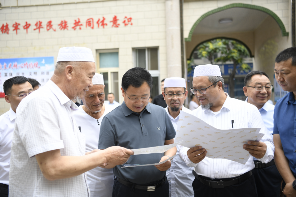 在新华清真寺“像爱护自己的眼睛一样爱护民族团结”“像珍视自己的生命一样珍视民族团结”等标语张贴在醒目位置。赵旭辉同所联系的宗教界人士深入交流,详细了解“五进”场所活动、安全工作有关情况后。他说,广大宗教界人士要坚持我国宗教中国化方向,讲好“中华民族一家亲、同心共筑中国梦”的银川故事,引导信教群众听党话、感党恩、跟党走,把清真寺建设成为展示坚持我国宗教中国化实践成果的重要窗口,传承中华优秀传统文化、践行社会主义核心价值观的重要阵地。